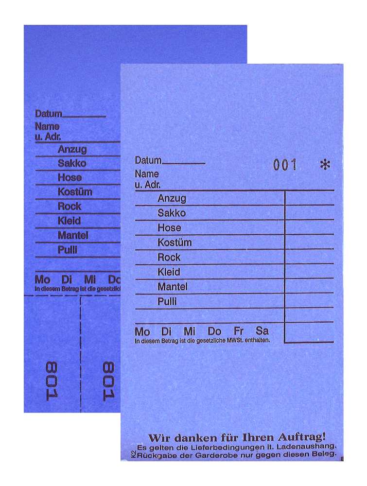 2. Blatt: Arbeitskarte/Rechnung mit 4 Abrissen, aus waschfestem HYDROFIX-Karton